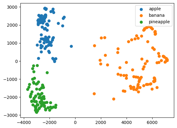 각 클러스터의 산점도가 잘 구분된다! 이 산점도를 보면 사과와 파인애플 클러스터의 경계가 가깝게 붙어있다. 파인애플 클러스터에서 혼동을 일으킨 이유를 알 것 같다.
