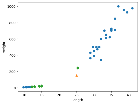 훈련 세트와 테스트 세트에 도미와 빙어가 잘 섞여 있는지 산점도로 확인한다.
