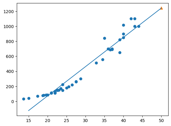 앞서 구한 기울기와 절편을 이용해 농어의 길이 15에서 50까지의 직선과 훈련 세트의 산점도를 그려준다.