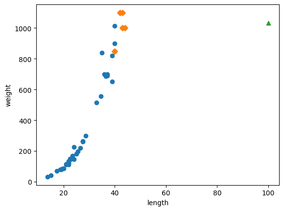 훈련 세트와 50cm 농어, 이 농어의 최근접 이웃을 산점도로 확인한다.
